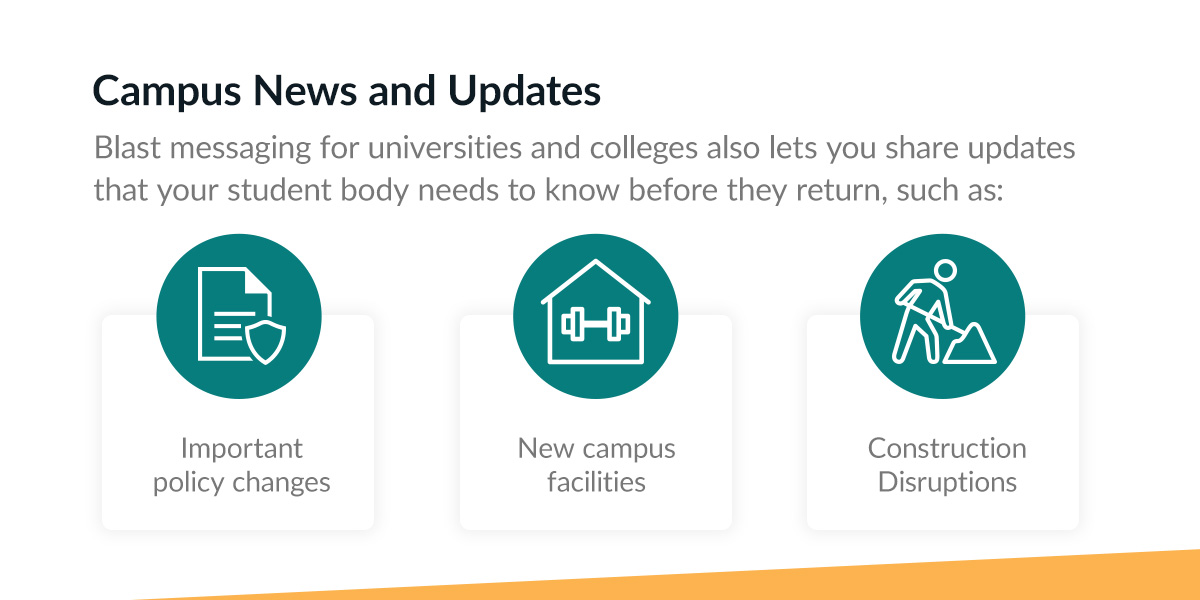 Blast messaging for universities and colleges also lets you share updates that your student body needs to know before they return, such as important policy changes, new campus facilities or any construction that will potentially cause disruptions.